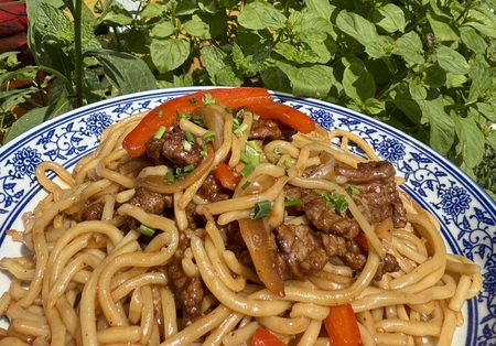 makaron pszeniczny smażony z jajkiem, warzywami i wołowiną