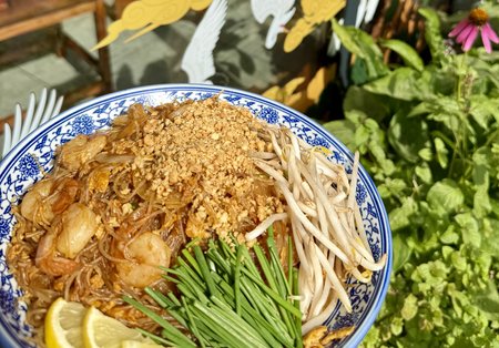 Smażony makaron z woka z jajkiem, krewetkami, kiełkami fasoli mung, szczypiorkiem, pastą tamaryndowca, sosem rybnym oraz posypany z siekanymi orzeszkami ziemnymi.