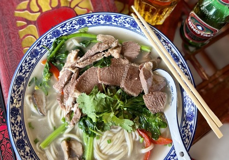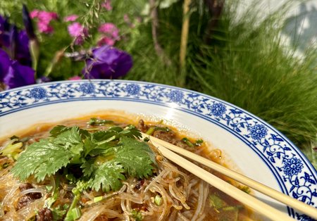 Ostra zupa z siekaną wołowiną, makaronem sojowym i kapustą pak choi oraz kolendrą.